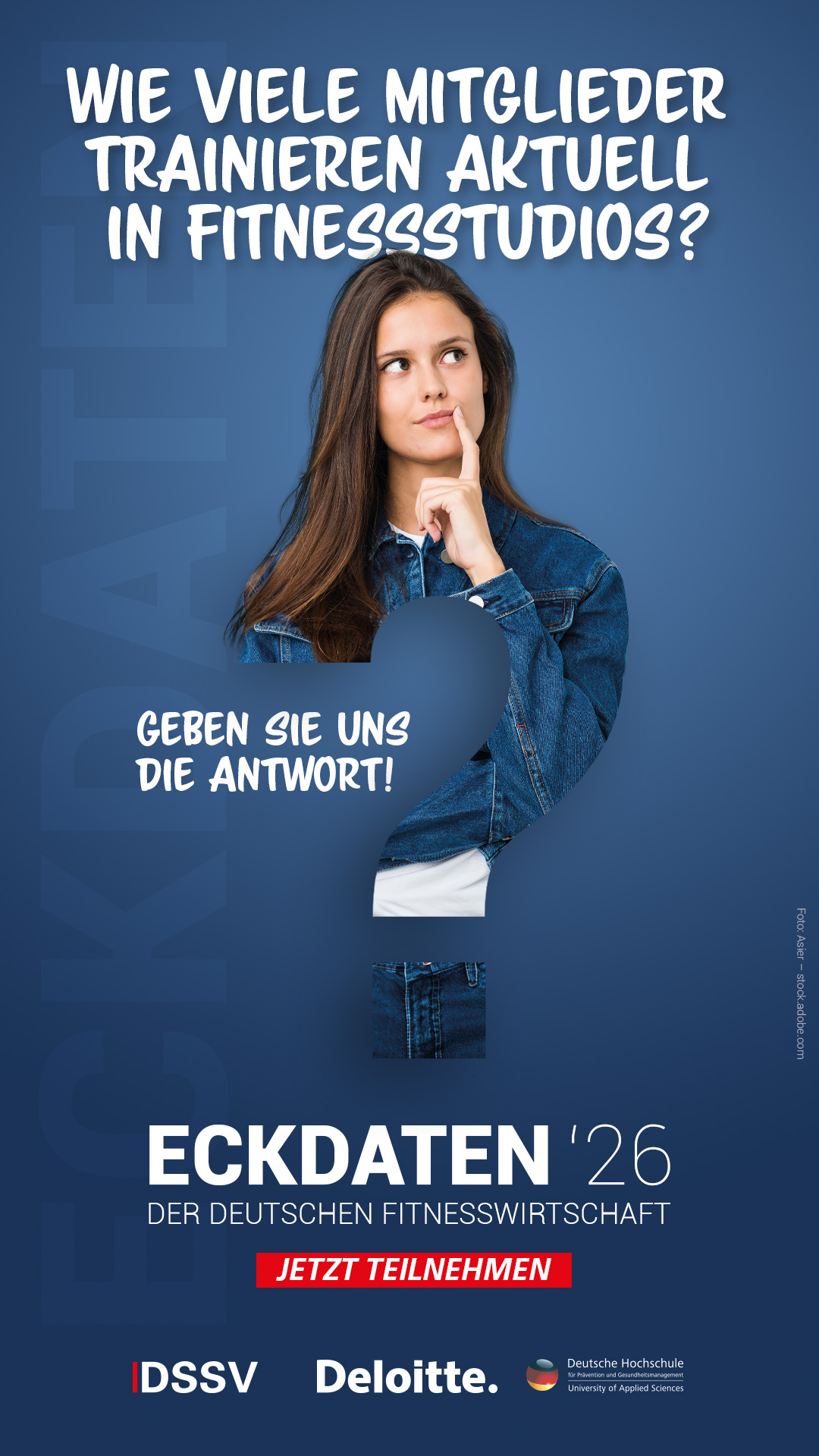 Der DSSV, Deloitte und die DHfPG garantieren den sorgsamen Umgang mit allen Daten. Die Ergebnisse werden im März 2026 unter dem Titel „Eckdaten der deutschen Fitnesswirtschaft 2026“ veröffentlicht. Vonseiten der DHfPG wird die Studie durch Prof. Dr. Sarah Kobel betreut. Wenn Sie Fragen zu dieser Erhebung haben, schicken Sie bitte eine E-Mail an eckdaten@dhfpg-bsa.de.
