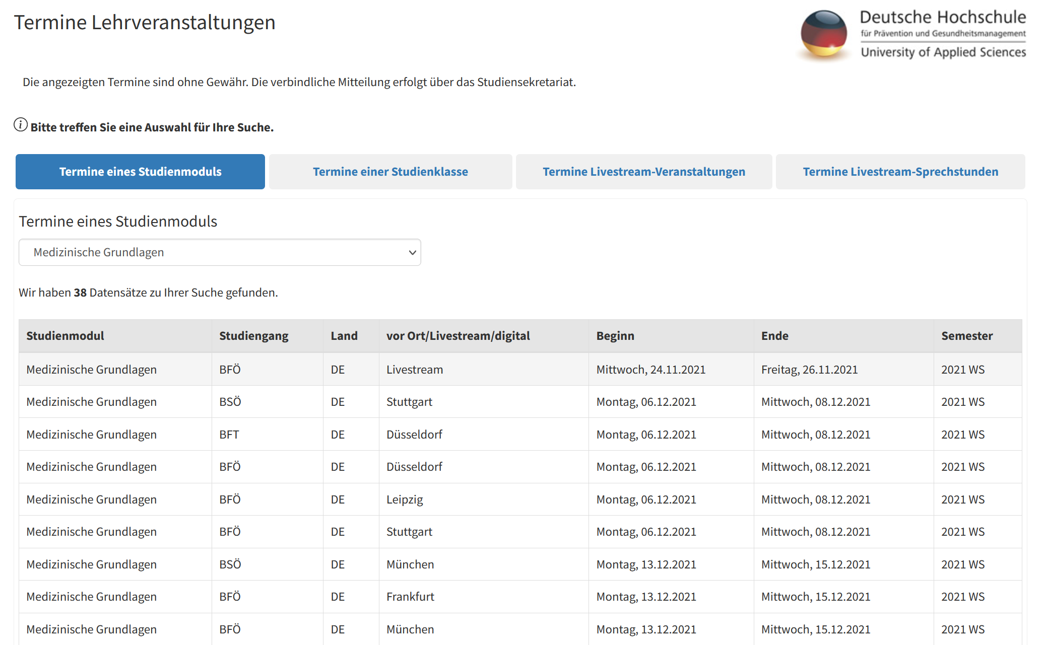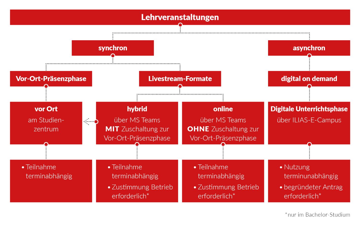 Die Lehrveranstaltungen beginnen am ersten Tag immer um 10 Uhr, an Folgetagen um 9 Uhr. In der Ergebnisdokumentation im ILIAS-Briefkasten finden die Studierenden zum Studienbeginn die Termine für alle Lehrveranstaltungen (inkl. gewähltes Lehrveranstaltungsformat, geforderte Prüfungen mit Bearbeitungszeiten) ihres Studiums. Ob sie diese Lehrveranstaltungen als Vor-Ort-Präsenzphase, Livestream (hybrid oder online) oder digital on demand absolvieren können, erfahren Studierende über die zur Verfügung stehende Auswahl im Studienportal.